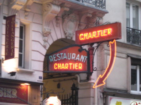 | Alla sera alla ricerca di un bel locale. Consultata la guida preziosa della mia XYL (Guida Routard), ci siamo inseriti nella coda di Chartier. Consiglio sicuramente questo bel ristorante. innanzitutto perchè è economico e si mangia bene. Ho degustato, tra gli occhi esterefatti dei miei gringhelli 6 gustosissime 'escargotes'; sono dei 'lumagot' o lumache, in italiano, quelle che ci mangiano l'insalata nell'orto e che non possiamo sopportare. Lì a Parigi hanno trovato il sistema; se le mangiano loro. Quando torno a casa provo anch'io a vedere se le nostre locali sono commestibili. Quindi come 'entree' 'escargotes', e per 'plate' un bel pezzo di carne con patate di contorno. Vino rosso 'Bordeaux' e 'acqua in caraffa'. Qui un inciso; ma possibile che da noi in tutti i posti ti debbano sempre rifilare delle acque minerali costosissime, mentre in giro per l'Europa l'acqua in caraffa è una cosa normale e naturale? Consiglio questo locale anche per l'atmosfera e l'arredamento. Camerieri con rigoroso grembiule nero che svolazzano tra tavoli stretti con centinaia di piatti in mano; specchi e arredamento, tavolini e sedie in legno in un gran locale di inizio secolo, scorso naturalmente. Non fatevi spaventare dalla fila; è veloce. Quando esce il 'maitre' alzate le mani con il numero delle persone della vostra compagnia e quando sarete chamati non esitate a tuffarvi nella porta rotante. Buon appetito.